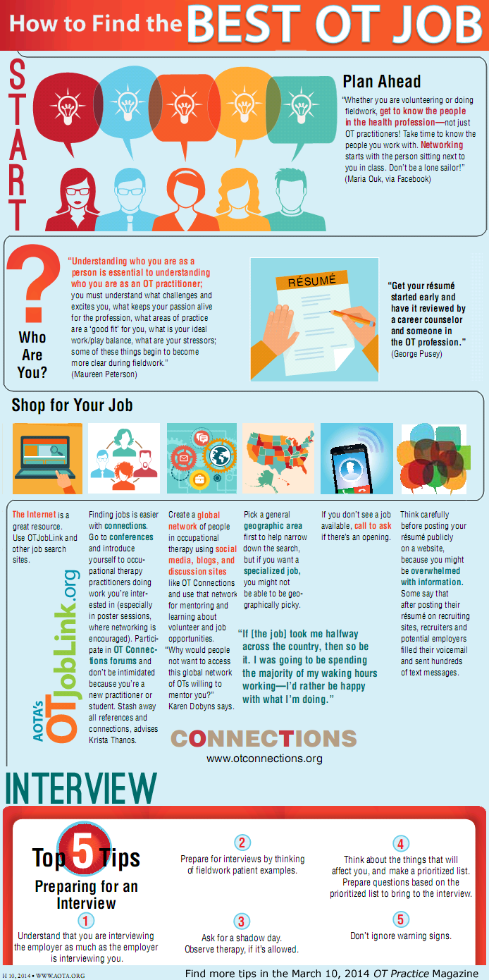 Best Advice: I am looking for a potential new hire to speak towards their pursuit of occupation based, evidence based practice and their ability to contribute on-going evaluation and analysis of current practices modeled within our department. I want to see that, despite being a “new grad”, the applicant has already developed a clinical identity from their fieldwork education experience and can demonstrate how they have enhanced service delivery in their previous rotations. Did they bring forward a standardized assessment and utilize it during their fieldwork? Did they implement a specific piece of adaptive equipment, or bring forward on-line resources to clients and caregivers that were new to their fieldwork educators? Did they initiate a journal club or utilize article findings to influence their service delivery with their patient populations while on fieldwork? I want to hear that they can contribute in their new professional position because they have already demonstrated these behaviors. Their ability to contribute to our team ultimately is an opportunity to contribute to the profession of occupational therapy as a whole. I am also looking for an applicant to speak to their desire to take fieldwork education students. This demonstrates an investment in professional growth and development. It shows me that they are not afraid to tackle challenges or be spurred onto best practice.